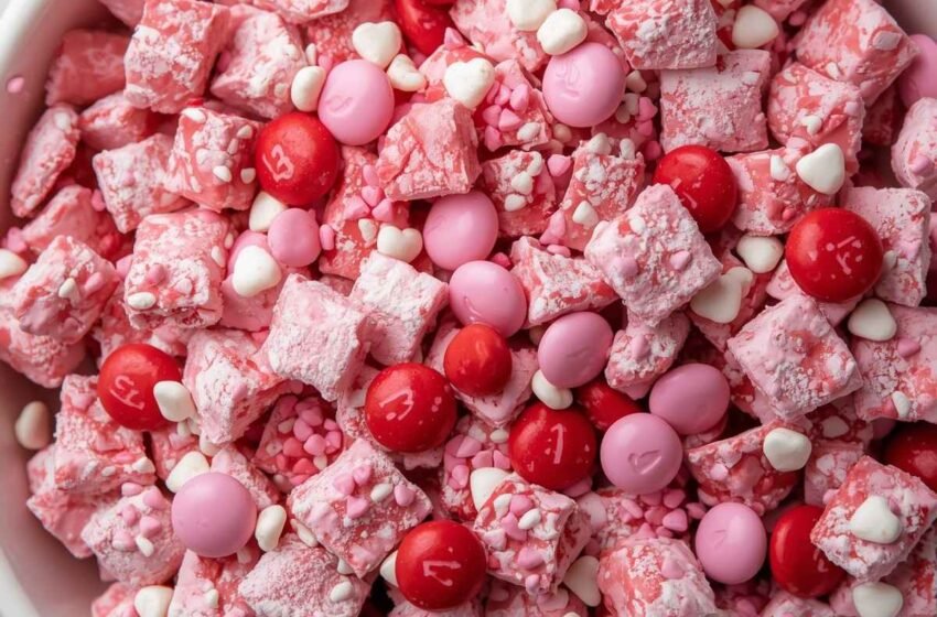 Valentine’s Day Muddy Buddies are a quick, no-bake snack that’s as fun to make as it is to share. Pink and red candy-coated cereal mixed with powdered sugar, colorful M&M’s, and festive sprinkles creates a sweet, crunchy treat perfect for dessert tables, party favors, or thoughtful homemade gifts. With its playful color palette and simple preparation, this Valentine’s twist on classic puppy chow is sure to impress friends, family, and that special someone.